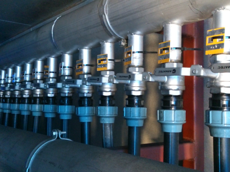 KS Geoenergis första större projekt var köpcentret på Västerslätt utanför Umeå som byggdes 2014. Till huvudbyggnaden för IKEA borrades 50 x ca 200 m (totalt 10265 m) och till Ikano (Avion) 95 x 200 m. Bilden är från kassunen (samlingsstocken) till de 95 brunnarna under parkeringsplatsen.